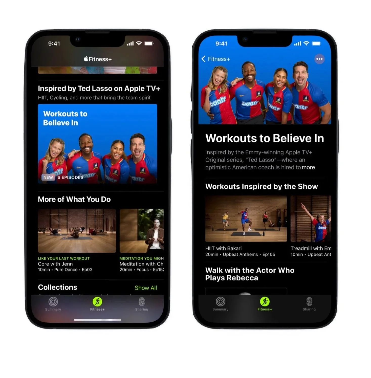 Four themed studio workouts built around Ted Lasso's "Believe" ethos — the sign as a visual anchor in workout backgrounds, trainer styling echoing the show's aesthetic, music from the soundtrack. Two Time to Walk episodes with cast members. A dedicated Ted Lasso Editorial Room in Fitness+ with shelf architecture tied to the Season 3 arc. I defined the IP language framework with Legal so content could move at production velocity without individual review on each asset.